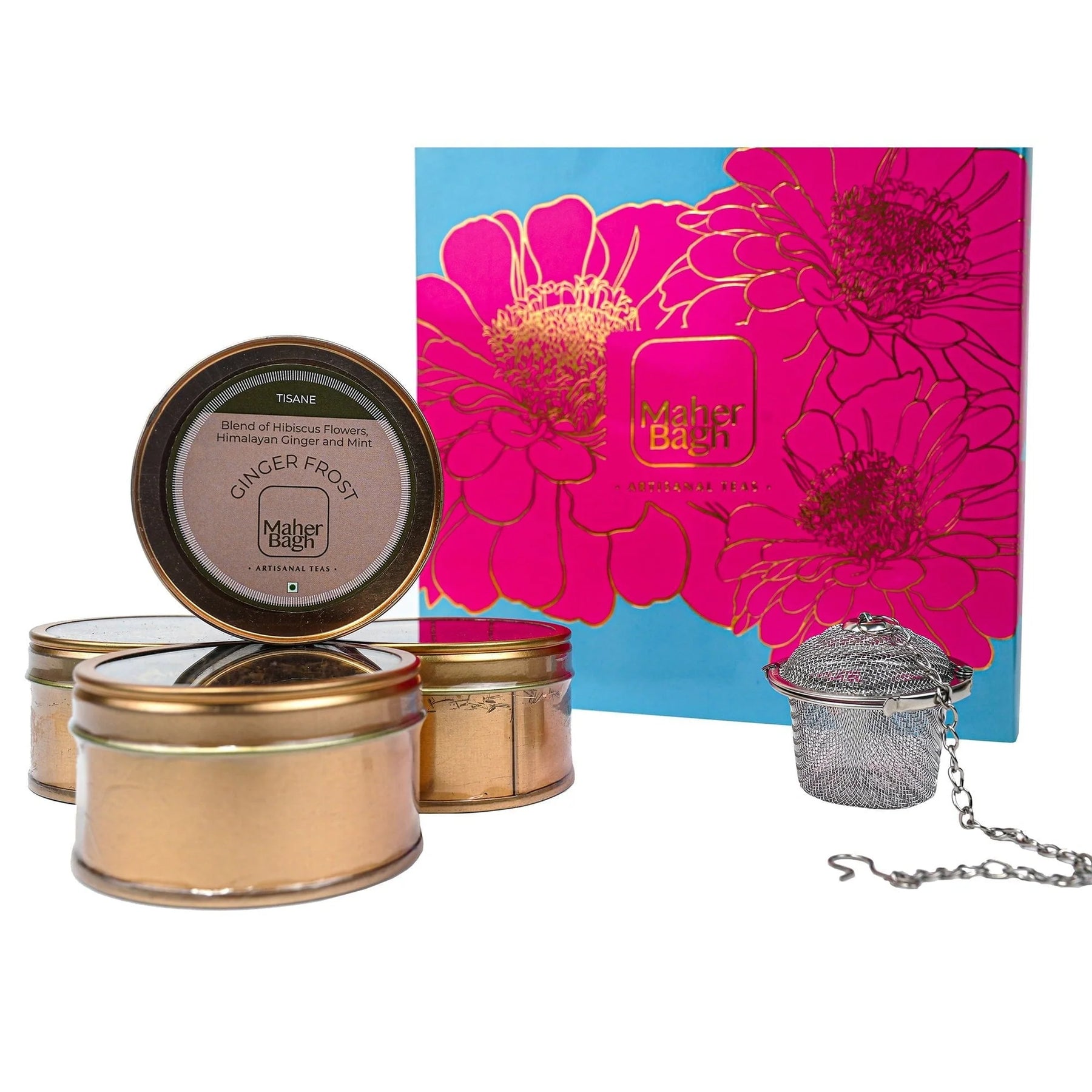 Elevate your tea experience with our "The Blush Box." This thoughtfully curated collection features four enchanting mini window tins and a stylish tea infuser, promising a journey through delightful flavors.