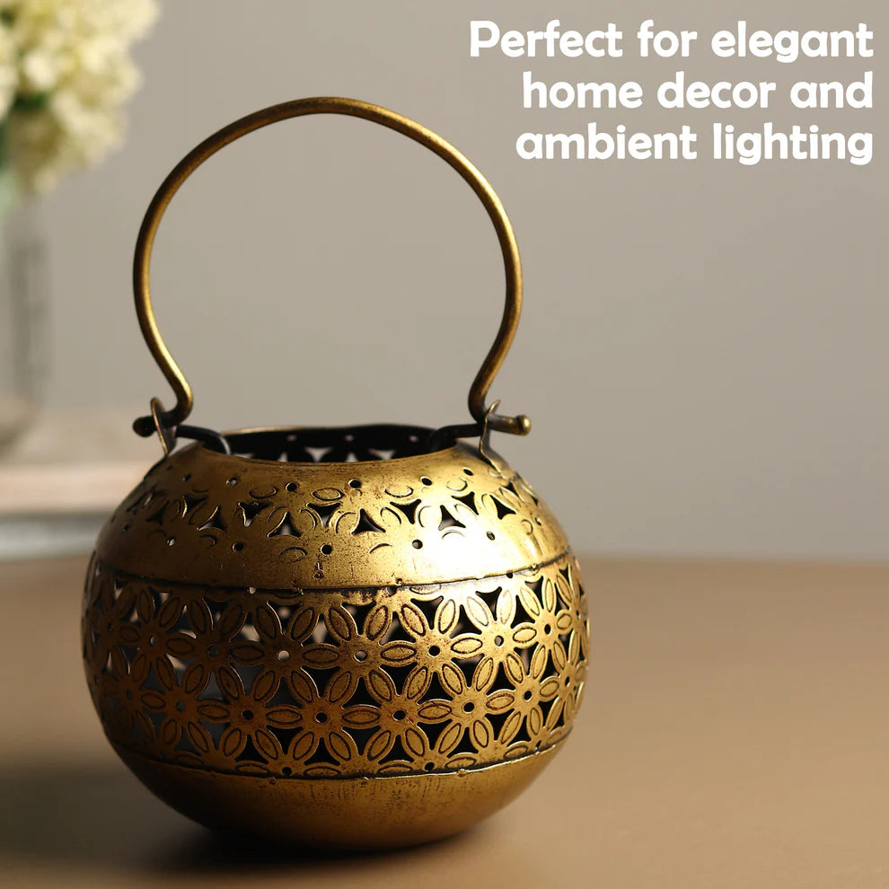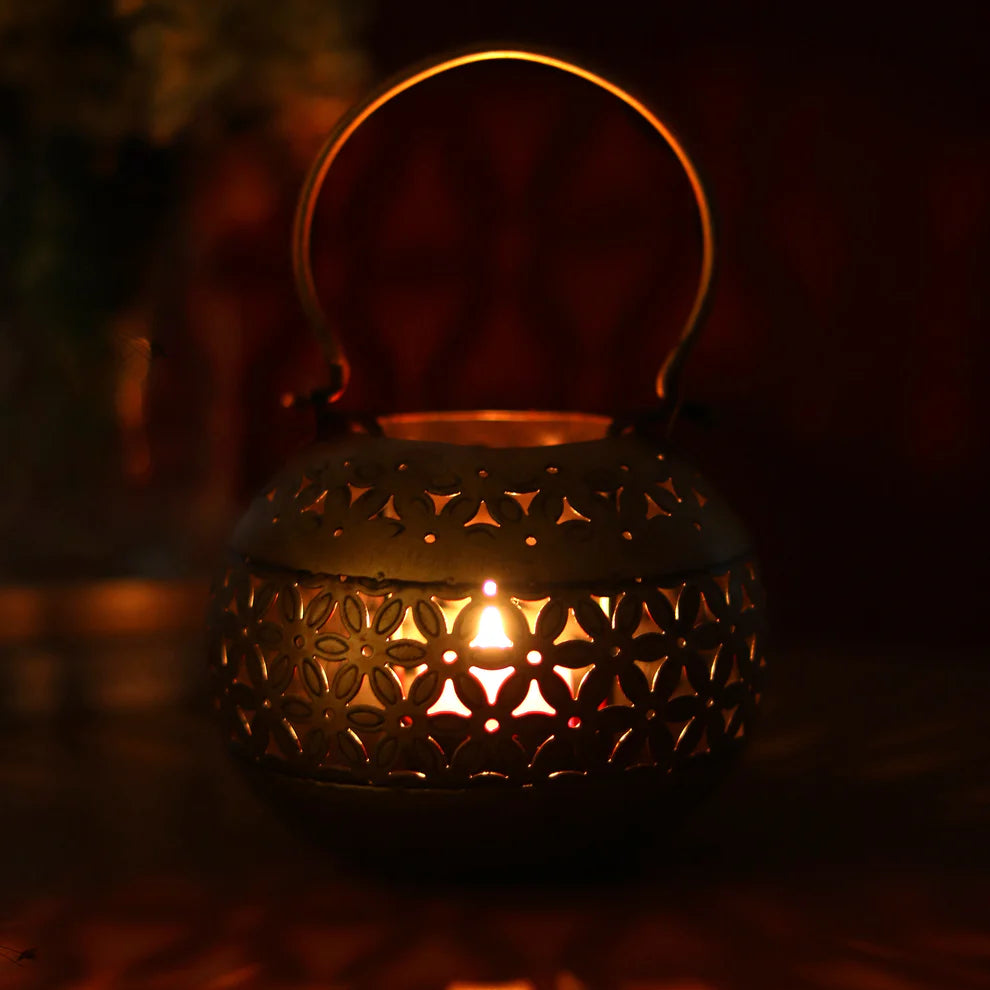 Matka-shaped T-light candle holder with intricate design. These metal decor pieces showcase the exceptional craftsmanship of Indian artisans with their intricate floral latticework and classic Rajasthani design. The golden finish and elegant design make them a beautiful addition to any home decor, evoking a sense of heritage and sophistication. These unique T-light candle holders are not only perfect for creating a warm, ambient glow in your space but also serve as a thoughtful and charming gift for any occasion.