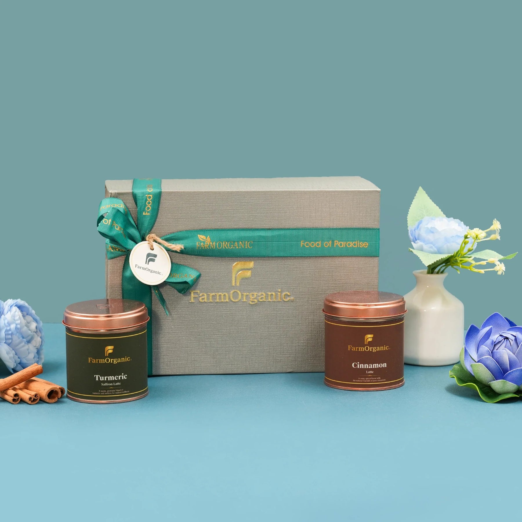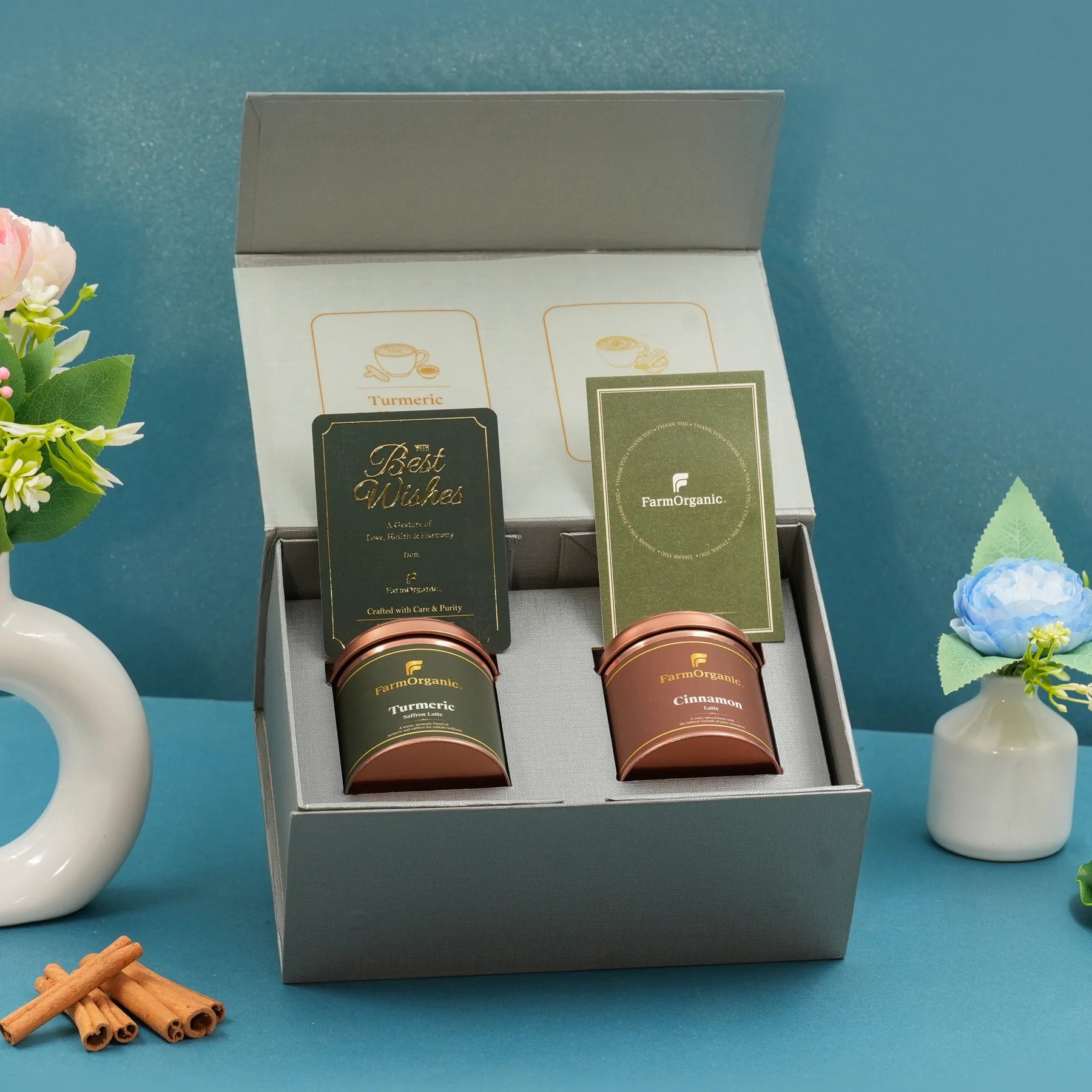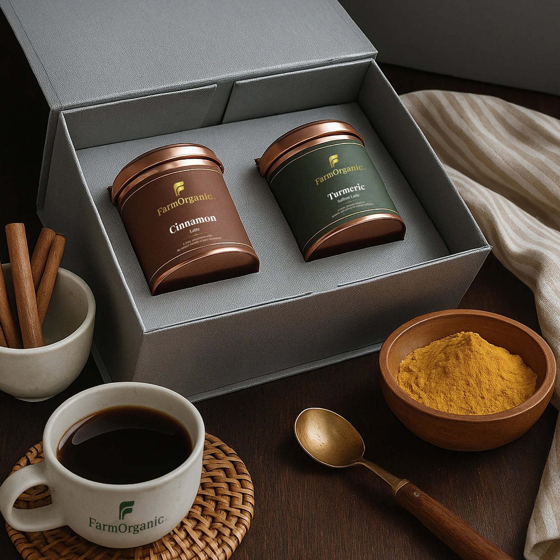 Aurora Brews Gift Box with Organic Turmeric Saffron & Cinnamon Lattes. A wellness-inspired, elegant hamper—perfect for gifting or daily rituals, crafted from pure organic ingredients.