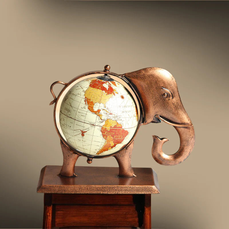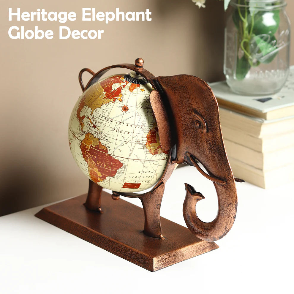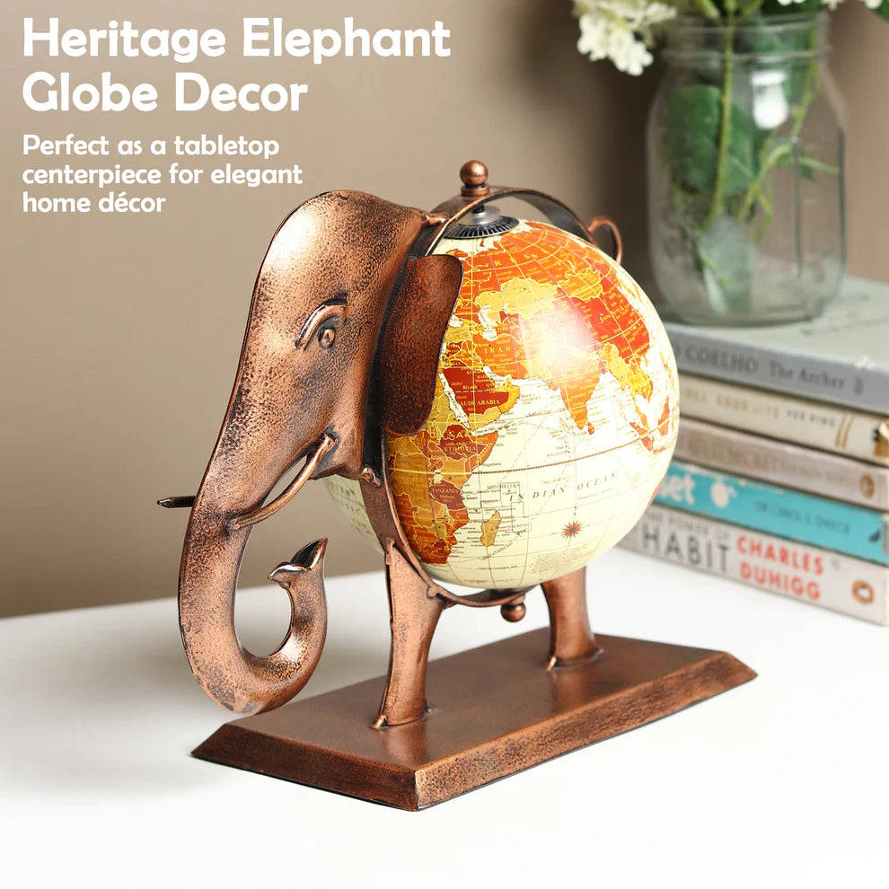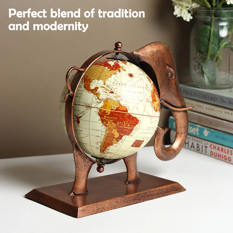 This exquisite work of Indian craftsmanship includes a one-of-a-kind online table décor item that blends a globe with a detailed elephant theme. The elephant, a symbol of strength and heritage in Indian culture, is adorned with colorful patterns and embellishments that reflect traditional Indian artistry. The decorative globe, encased within the elephant's frame, adds an educational and decorative element, making it a perfect blend of functionality and aesthetic appeal. Ideal for homes or offices, this decor item celebrates cultural heritage while serving as a distinctive centerpiece.