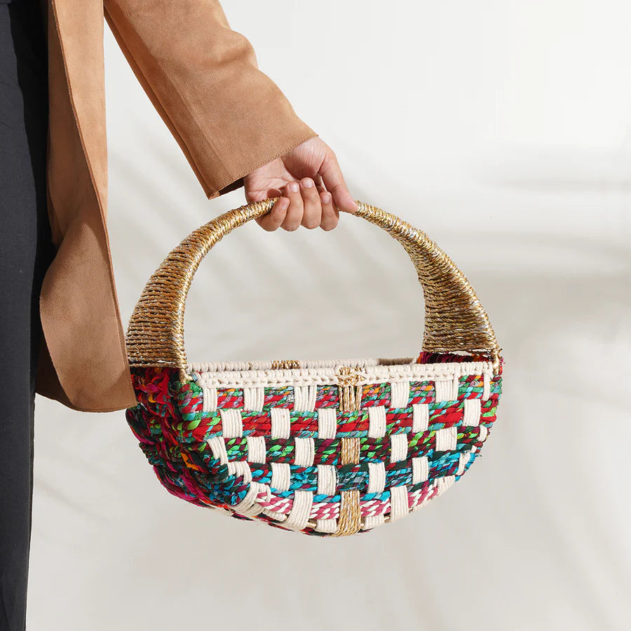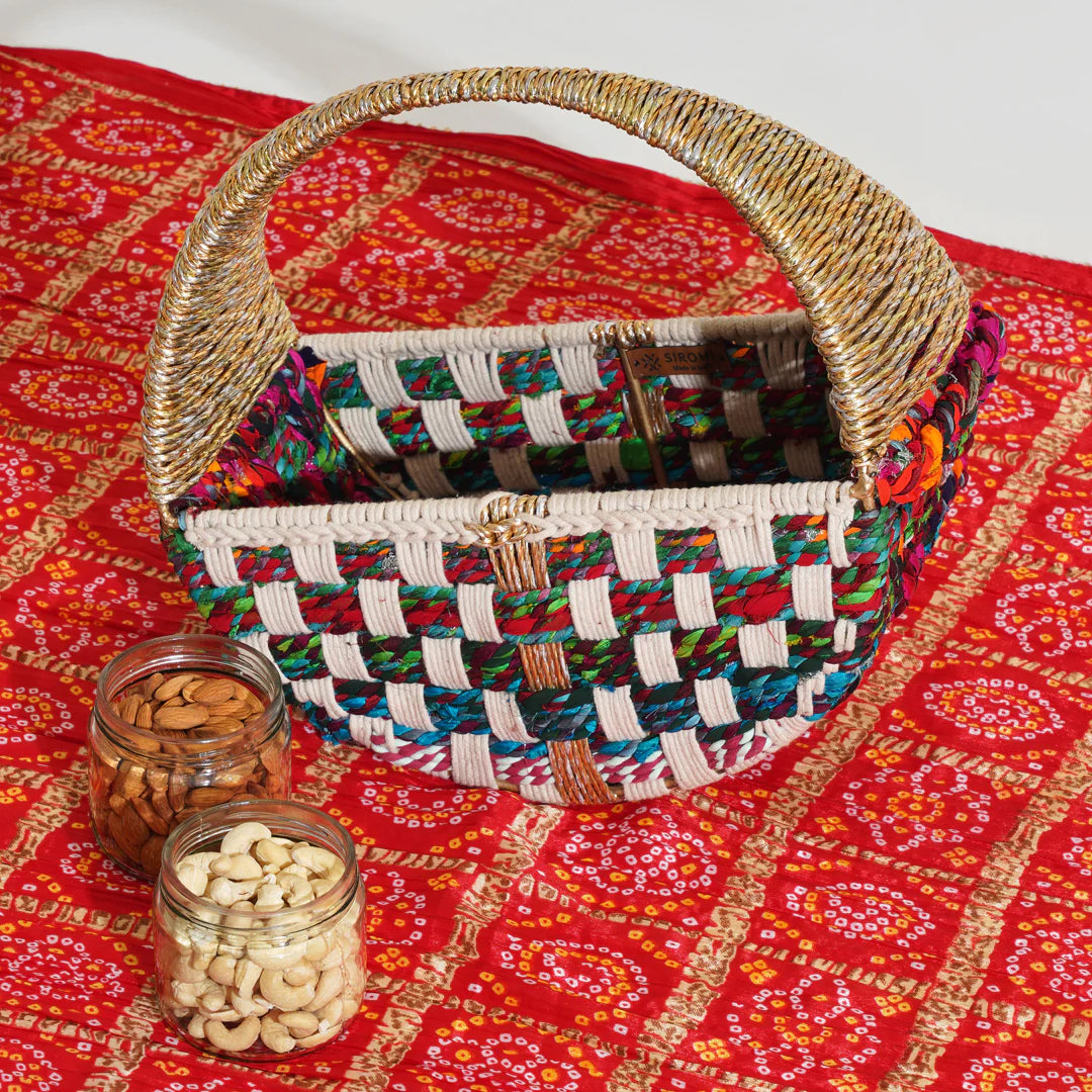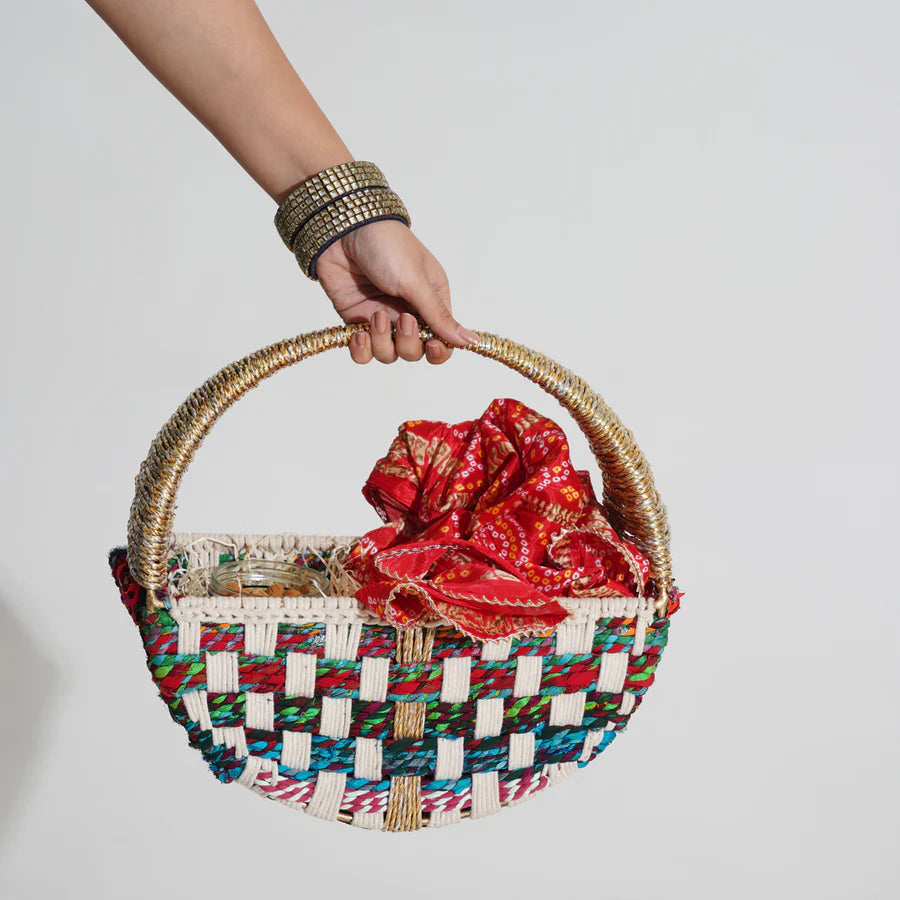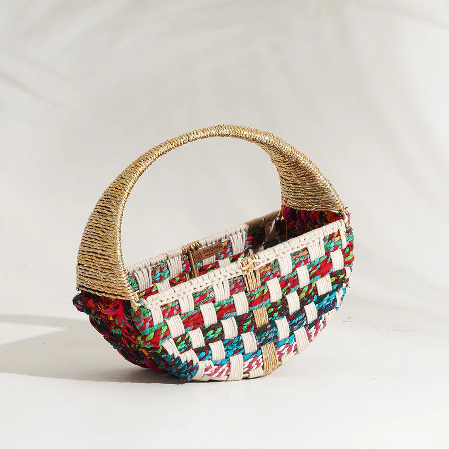 Handwoven with colourful upcycled textile waste ropes on a sturdy iron frame, this little basket is the most adorable sustainable home decor item you can have! Its handle has been delicately woven using bold gold ropes made from upcycled plastic waste. Use it to keep your essentials on the bedside or home offices as a desk accessory or make beautiful gift hampers- the possibilities are endless!